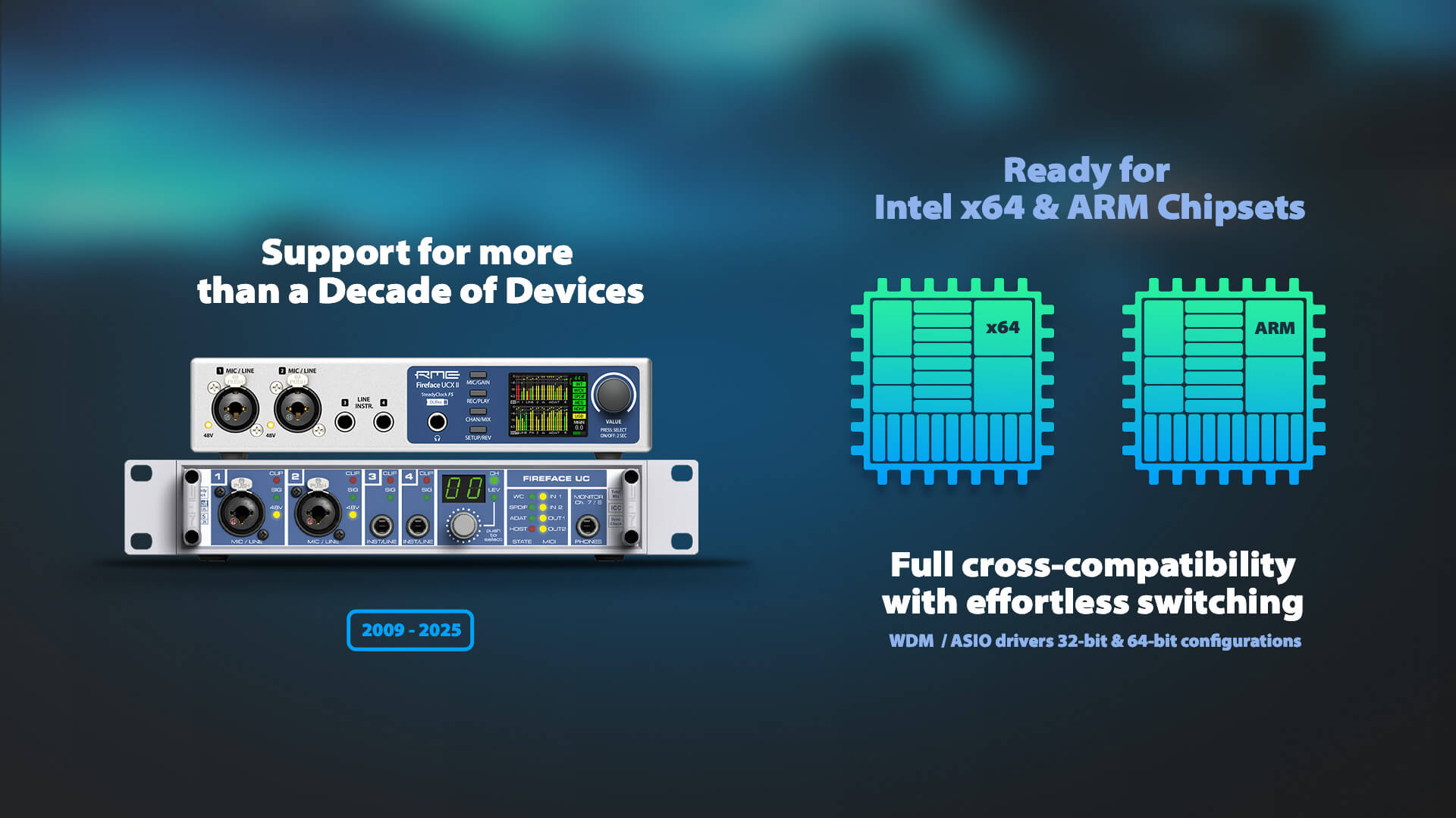 Mit Microsofts verbesserter Emulationstechnologie für native Windows-Anwendungen sind aktuelle ARM-Laptops nun bereit für professionelle Audioproduktionen. Allerdings ist für Audio, welches Treiber benötigt, eine Emulation keine Option. Daher hat RME seine bewährten WDM- und ASIO-Treiber weiterentwickelt, und sie vollständig kompatibel zu Windows 11 ARM gemacht, so daß sie das Potenzial der Snapdragon X Chipsätze ausschöpfen, und eine nahtlose Integration mit den neuesten Computerplattformen gewährleisten.