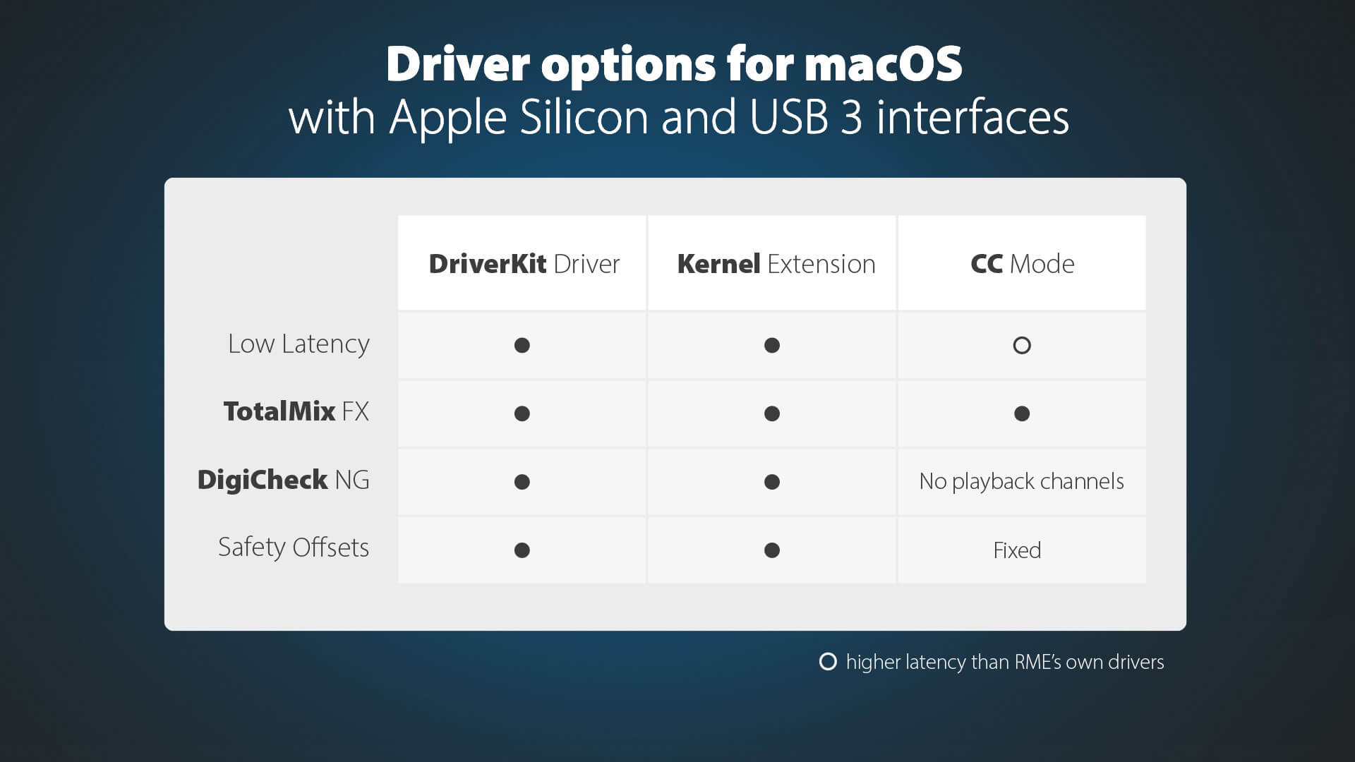 - Class-Compliant-(CC)-Modus – Apples integrierter Audiotreiber, jetzt über RMEs Einstellungsdialog und TotalMix FX steuerbar