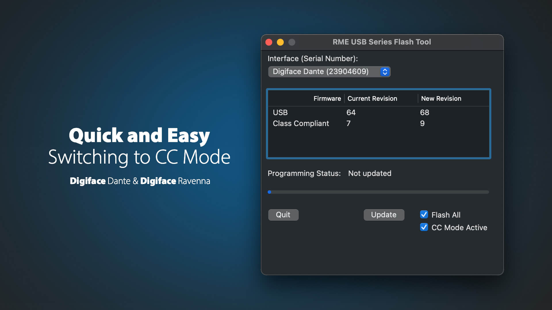 Der Wechsel in den CC-Modus bei Digiface Dante und Digiface Ravenna ist schnell und einfach über das Mac Firmware Update Tool möglich, indem die neu hinzugefügte CC-Modus-Option einfach an- oder abgewählt werden kann.