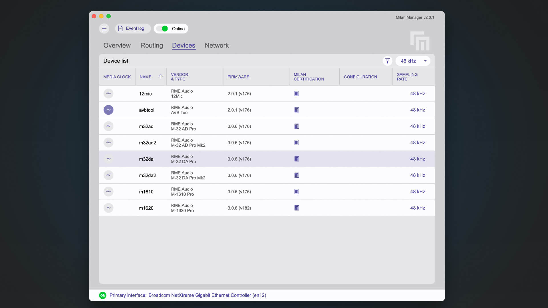 RME joined the AVNU alliance – creator of MILAN® – in 2021 and has since then extended their performant AVB implementation towards Milan compliance in several steps, beginning with the introduction of the efficient AAF stream format, CRF media stream clocking functionality and dynamic mappings. Although RME stated early-on that their existing firmware is in fact interoperable with MILAN®, the certification gives users confidence that they can connect devices out of the box and start streaming up to 128 channels of uncompressed audio with deterministic, super-low latency.